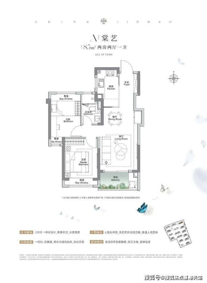 先来看下97㎡样板房,三房一卫飞机户型,三开间朝南搭配“3个飘窗+双阳台系统”,不管是采光、视野、通风、私密性,还是实用性都十分出色。