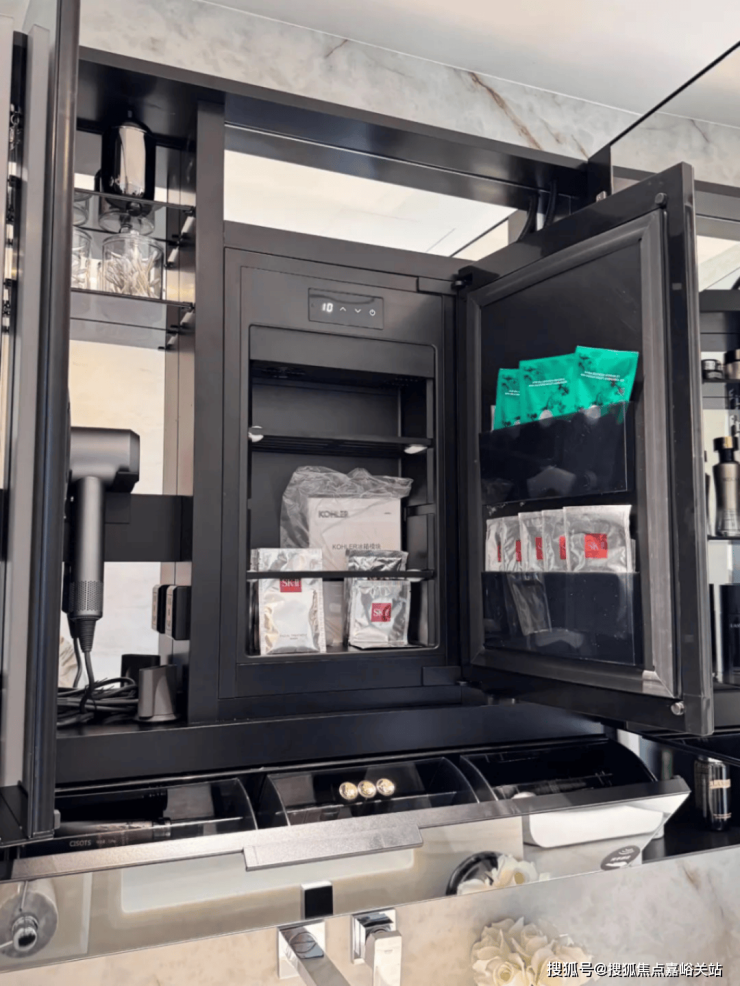 值得一提的是,项目卫生间采用了科勒一体式镜柜,区别于市面上常见的分装拼接柜。这种一体化设计将镜柜、照明、美妆收纳和美妆冰箱功能高度集成,带来更高的美观度与使用便利性!