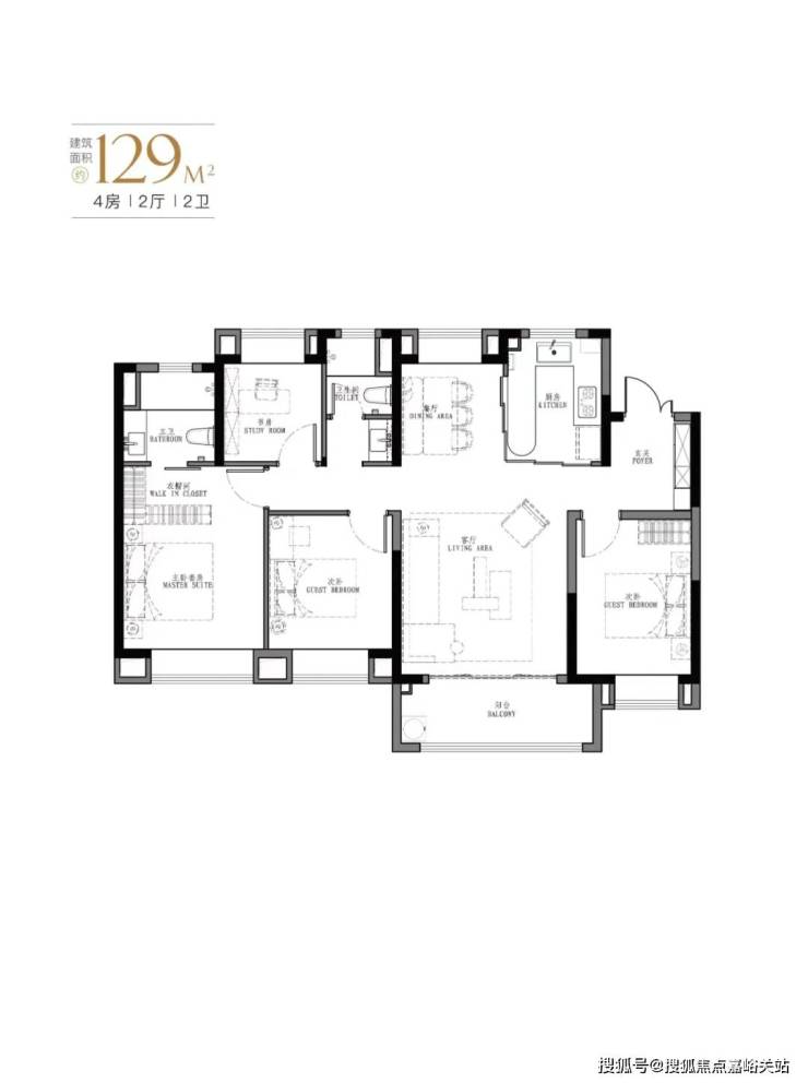 产品: 103㎡、107㎡的三房两厅两卫及123㎡、129㎡的四房两厅两卫。