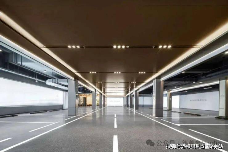踏入地库,即可感受到五星级豪华酒店的开阔布局。主通道以艺术风格地面标线装饰,搭配柔和的暖金色照明,营造出极致奢华与精致的视觉盛宴。在材料选择上,巧妙融合冰火板与岩板,打造行车通道的廊柱,同时采用仿透光云石的定制车牌标识,部分主要通道更是选用全铝板装饰吊顶,每一处细节都体现了高端社区的非凡品质。