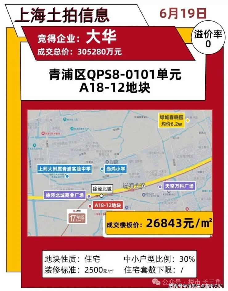 大华徐泾项目,成交总价305280万元,成交楼板价26843元/㎡,由大华集团底价拿下。地块出让面积4.94万方,容积率2.3,建筑面积约11.37万方,装修标准不低于2500元/㎡,中小套户型比例不低于30%。