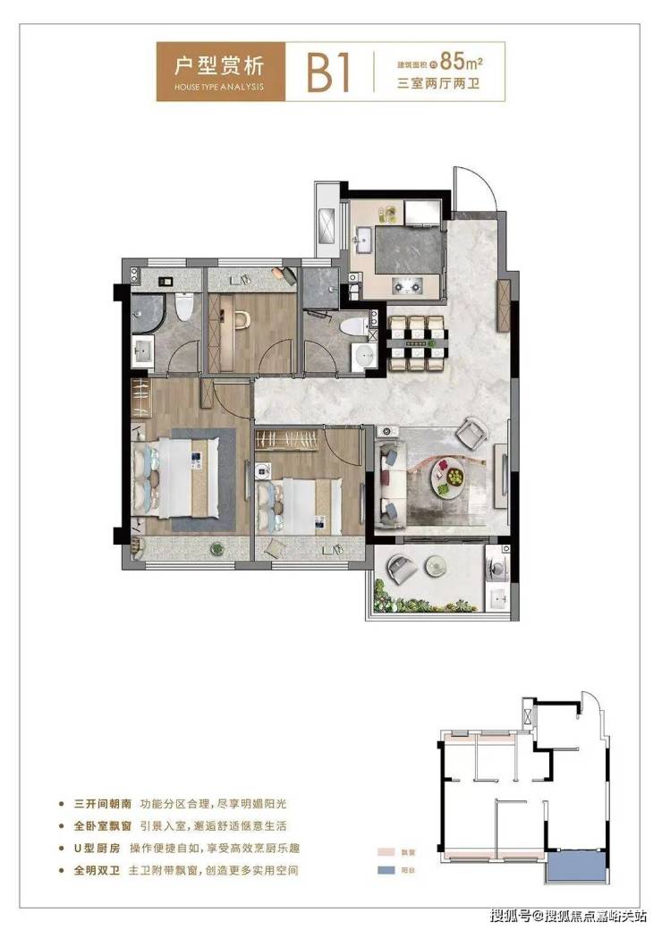 85平3房2卫,动静分离三开间朝南,厨房U型动线,主卧自带独立卫生间和飘窗,这个户型兼具低总价和功能性。