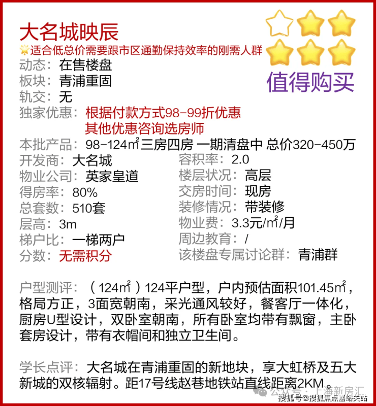 最新消息:青浦重固全新盘「大名城·映辰」正在热销中!推出建面约98-124㎡三房四房,总价320-450万!