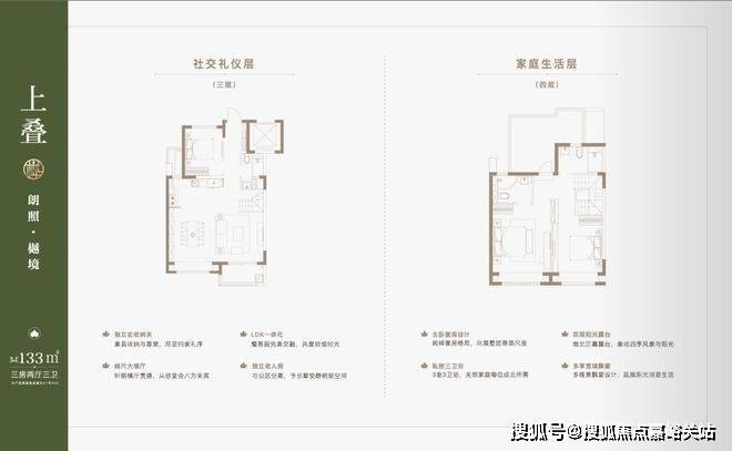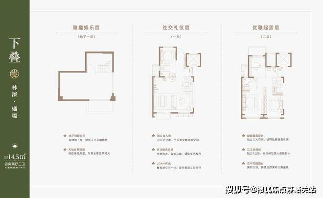 叠墅产品分为4F、6F层叠加, 主力产品建面约约122-133㎡上叠,132㎡大平层,131-145㎡下叠。