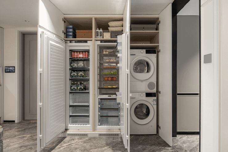比别人更多的厨电交付。别人可能交付三件套、五件套,信安里交付七件套,还都是德系博世产品。博世两台嵌入式冰箱、洗衣机、烘干机、灶具、油烟机、蒸烤一体机等等,可以说诚意十足了。