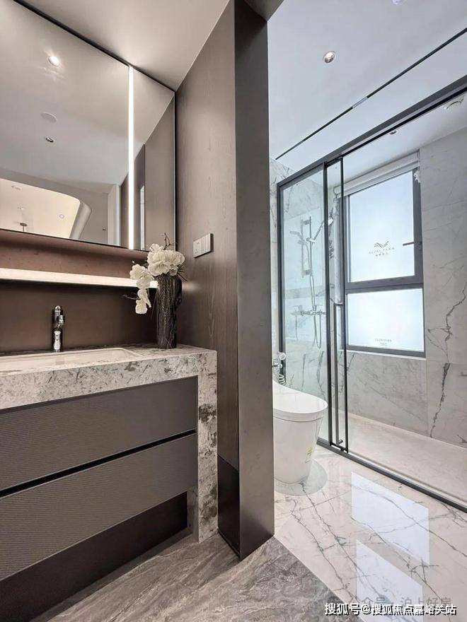 卫浴墙面采用寒江雪大瓷砖铺装,淋浴部分地面选用整块天然大理石