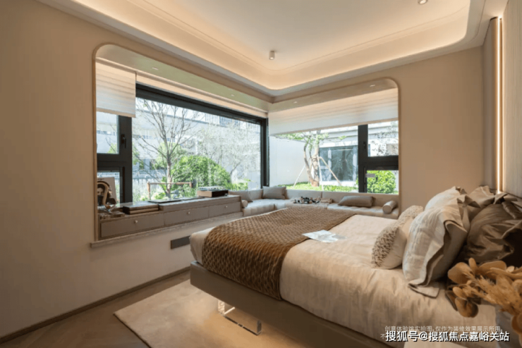其次, 边套主卧的约270°无柱转角超宽巨幕景观视界。这个景观视野和主卧采光度,实在是惊艳。