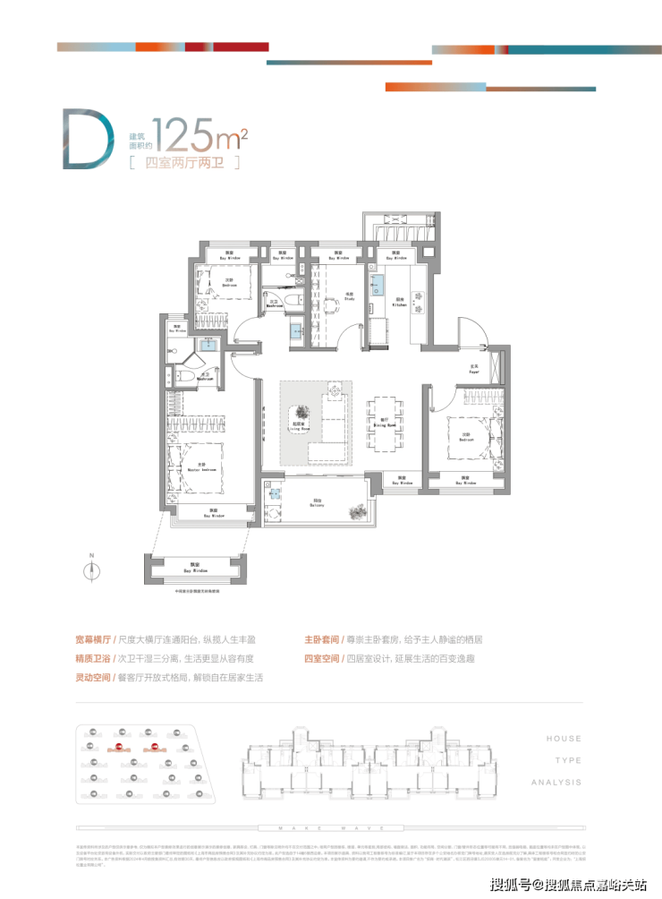 建面约125㎡的四房户型,拥有超大尺度横厅连通阳台,四开间朝南+主卧大套房,给予业主不输千万豪宅的居住体验!