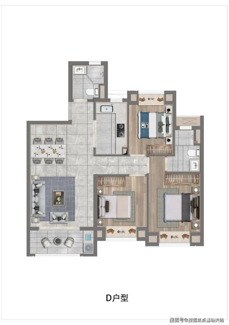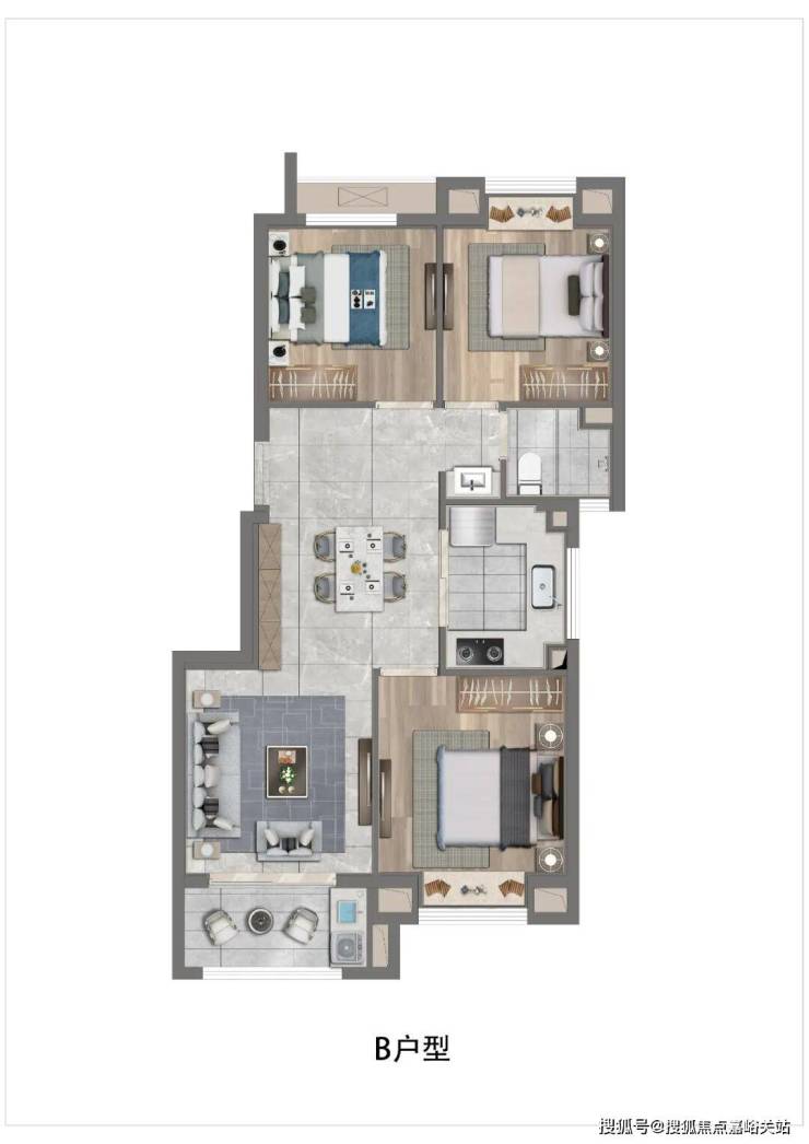 老实说,这个户型有3个卧室,很符合三口之家偏改善或者是二胎家庭的居住需求。