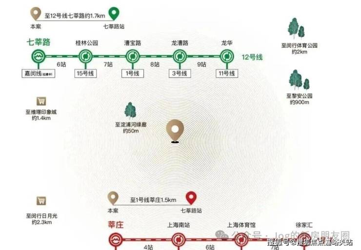 商业方面,离项目最近的商业是12号线七莘路站地铁上盖综合体维璟印象城,直线距离仅相距约1.4公里