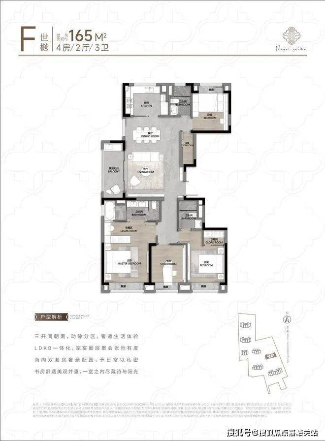 104㎡3户型特点:该户型多为楼栋的东边套,是一个观景户型。客厅连接270°阳台,视野出众。双卧朝南,阳光满溢。从次卫布局看,如果家庭人口较少,该户型还能做成双套卧。
