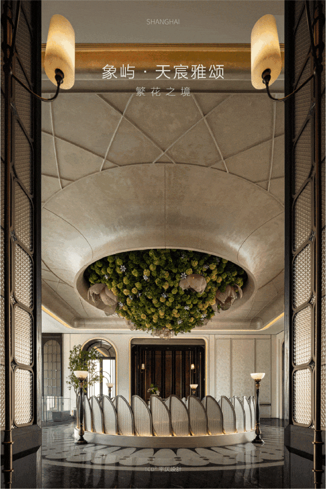 进门之后,恍若走进一幅立体绽放的画卷。 地面采用了 石材拼花 ,纹理如行云流水般舒展,在光影交错间勾勒出 低调的奢华。