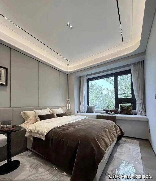 主卧转角落地窗+飘窗,也算是非常少见的了。净面宽约3.6m,不算进门的衣柜,进深大约5.7m左右。根据测算,可以放置宽约2m的床+2个床头柜(宽度约45cm/个)是可以的。