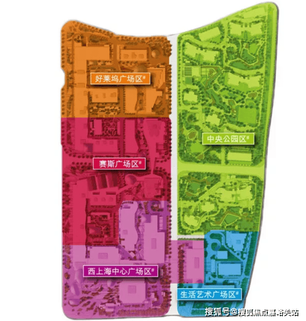 整个高尚领域划分成五大多元化生活主题:以住宅为主的中央公园生活区、提供娱乐设施的好莱坞广场区、设特色餐饮的赛斯广场区、设甲级商厦和星级酒店的西上海中心广场区,及适宜摆放现代艺术品的生活艺术广场区。