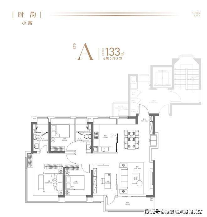 建面约133㎡4房(小高)约5.9m大面宽大横厅+主卧270°转角窗