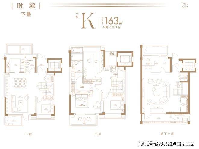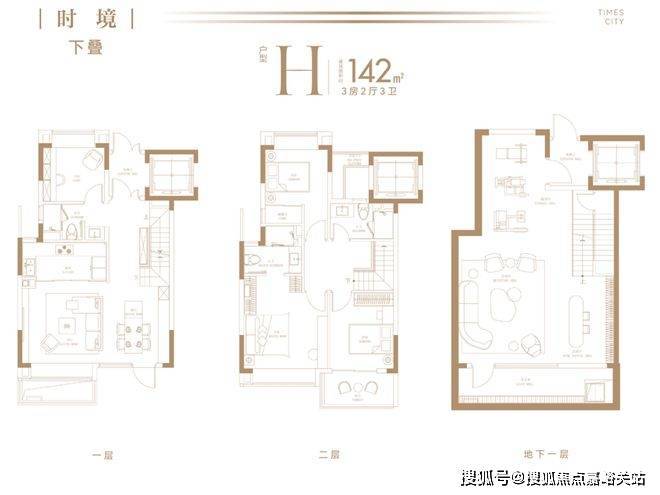 建面约142㎡下叠为例,地上两层、地下一层阔绰空间,动静科学布局,全面考量三代同堂与二胎家庭的居住空间需求,以人性化质感空间演绎舒奢生活。