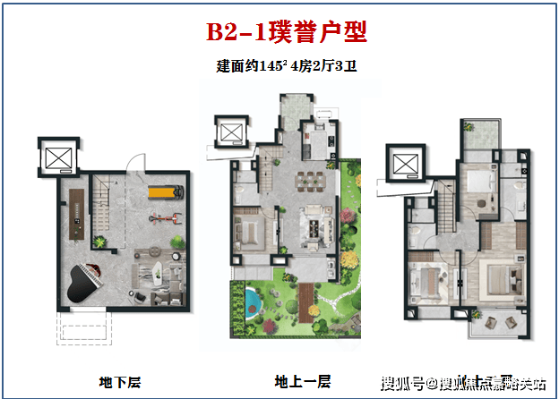 面积上与B1-1户型相同,建面约145㎡,功能区也大致相似。