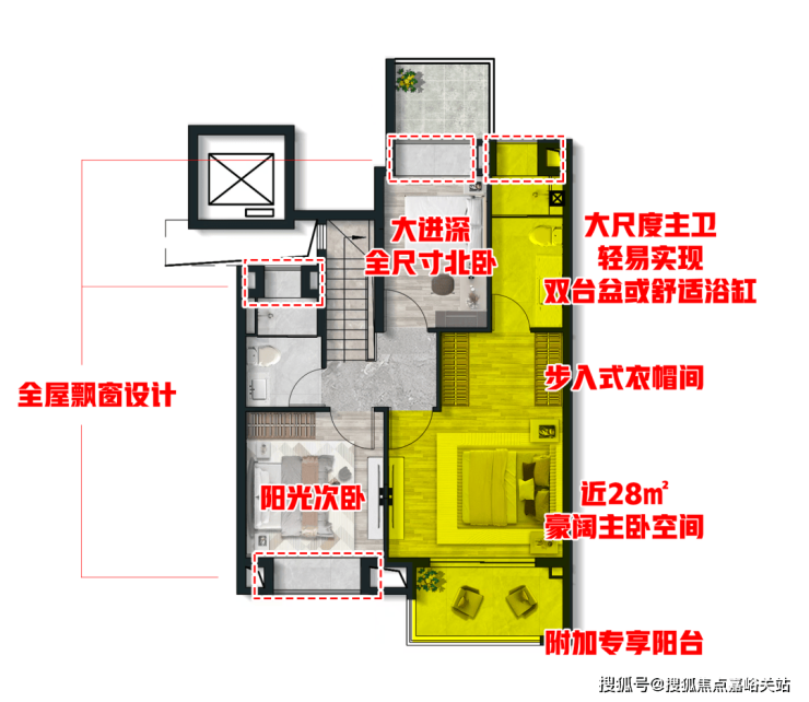 大尺度宽景阳台,宽度达到外框4米2,面积超7平米;转角观景落地窗设计,打造舒适休憩体验。