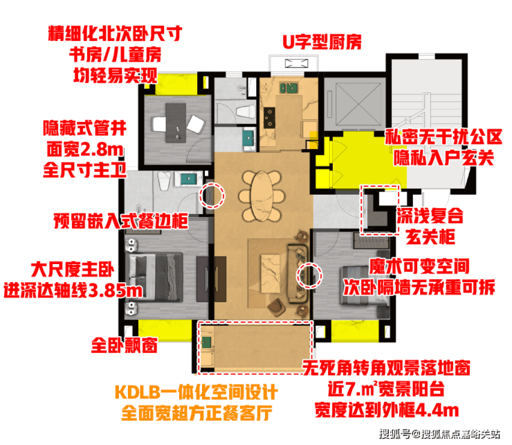 入户玄关及超大玄关柜设计,三开间朝南飞机户型,KDLB一体化设计,客厅次卧魔术可变空间,U型厨房,大尺度宽景阳台+转角观景落地窗,舒适北卧,三段式干湿分离客卫,全卧室飘窗,等等