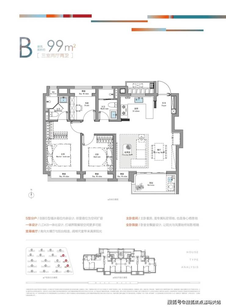 建面约99㎡B户型客餐厅配置 超大尺度横厅, 全卧室飘窗就连主卫也配置了一个飘窗;