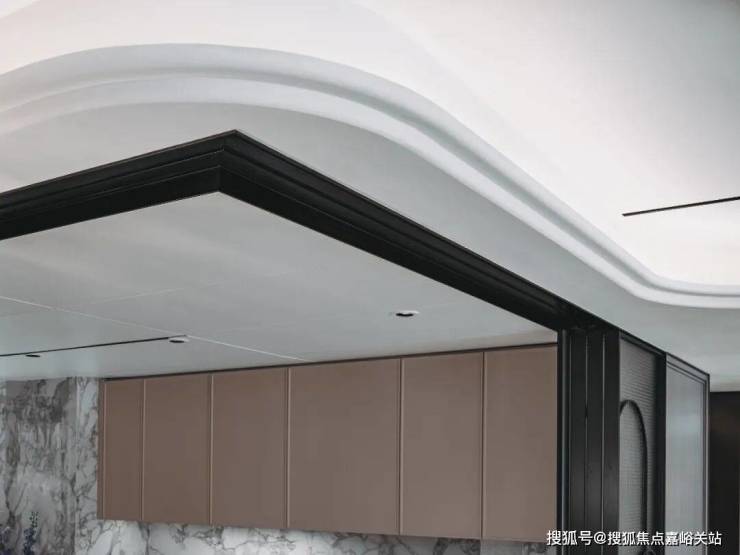 项目的天地墙也是细节满满:天花板设计圆弧吊顶,工艺极高颜值自然不俗。客厅整块的背景墙充满质感,卫生间通顶的大面墙砖极抓眼球。