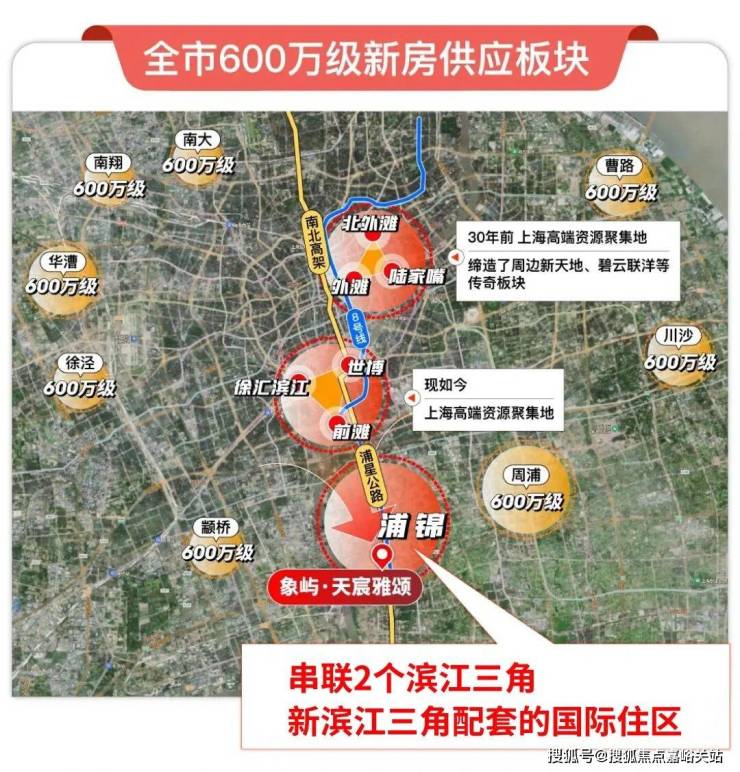 众所周知,项目高端城市资源高度集中在2大滨江三角:由外滩-陆家嘴-北外滩构成的传统中央商务区,由前滩-徐汇滨江-世博构成的新兴中央活动区。其他所有板块几乎都是经由它的价值辐射。换言之,谁距离他们更近通勤更快谁就更有未来!