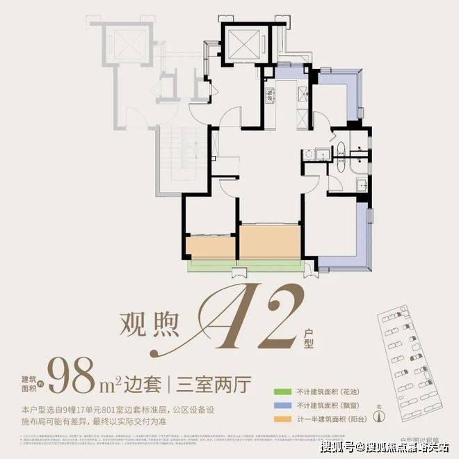 约98㎡3房:类一梯一户、全屋飘窗为标配,双阳台+花池是核心亮点(市面双阳台户型起步多为约110㎡),整体附赠约23㎡,是罕见的高实得率精致户型。