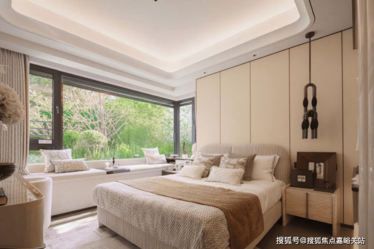 主卧270°转角飘窗,是“情绪自留地”:垫个软垫成阅读角,甚至能打造成迷你储物间,换季衣物收得整整齐齐。