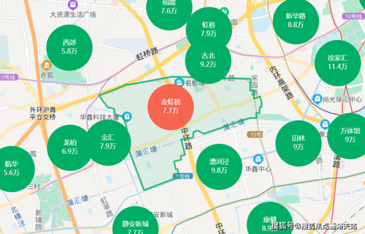 金虹桥地处闵行、徐汇和长宁3区交汇处,它的北面就是长宁天山板块,南面是漕河泾高新技术开发区,西面是上海风头正劲的大虹桥,东面则是徐汇田林和徐家汇, 地理位置十分出色,如今区域内的豪宅代表 古北壹号都能卖25万单价了!
