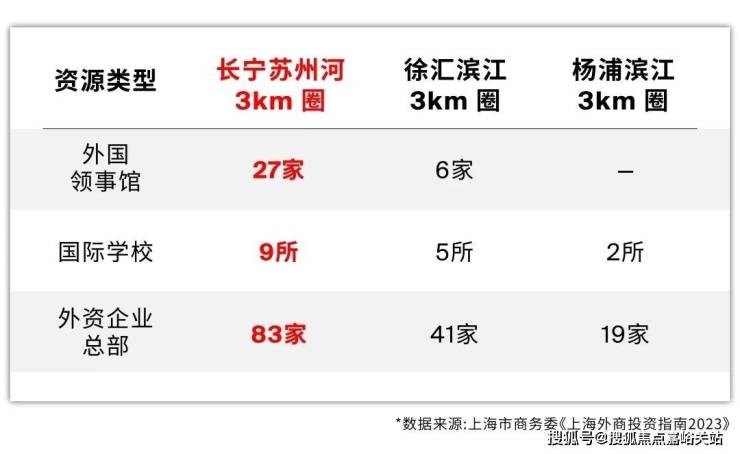 据上海市商务委《上海外商投资指南2023》数据显示,长宁涉外资源密度是徐汇滨江的2-3倍、杨浦滨江的4-10倍,是能够支撑国际客群支付溢价的!