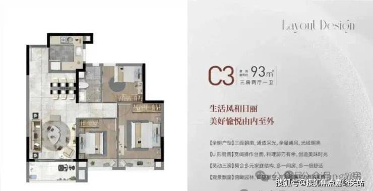 建面约93㎡3房2厅1卫,做到了三开间朝南+双卧室带飘窗+动静分离,室内通透明亮。