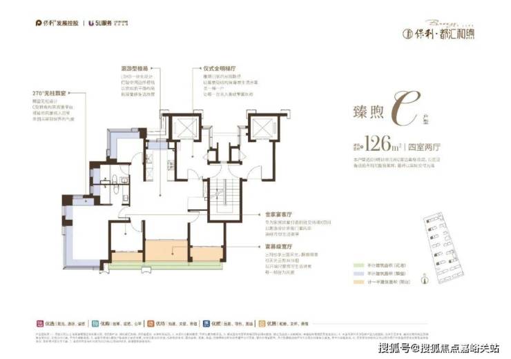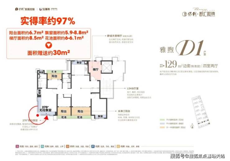 洋房标准层边套赠送面积约30㎡,实得率高达97%,相当于直接赠送约200多万价值,常规项目80%的实得率与之相比差距明显,该户型实际可享受常规155-160㎡的空间尺度。