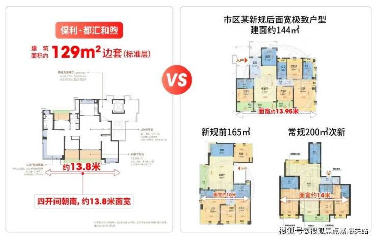 常规别墅多为两开间约6米面宽,而项目129㎡洋房全系四开间朝南,面宽近14米。