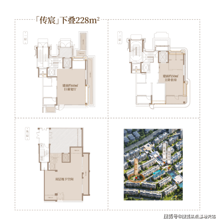「传宸」下叠228 ,拥享建面约110㎡南向花园(边厅)、建面约60㎡巨幕宽厅、建面约50㎡主卧套房以及建面超200㎡双层地下空间,一层一境,进阶三代阖居生活;
