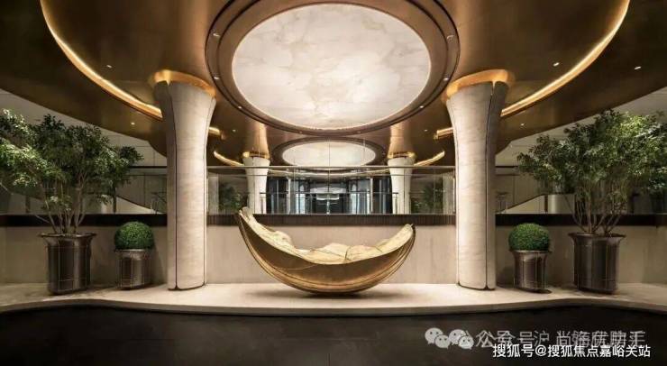 一汪深邃的「宇宙之心」漩涡水景,灵感源自梵蒂冈博物馆举世闻名的双螺旋楼梯,模仿宇宙星系流转的宏大景象,纳藏天地万物生生不息的力量。