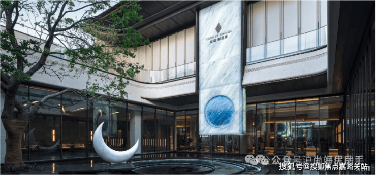 深藏于建筑怀抱之中的下沉式「琉璃光院」,是历经数十版方案淬炼出的灵魂之作。御湖境标志性汉白玉玄月族徽,与高10米的蓝水晶奢石光幕,共同演绎“日月同辉”的震撼场景。庭院深处50年乌桕树王矗立。