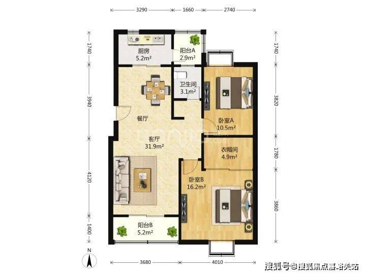 3、南向四开间,面宽约15.5m,独立餐客厅,南北通透