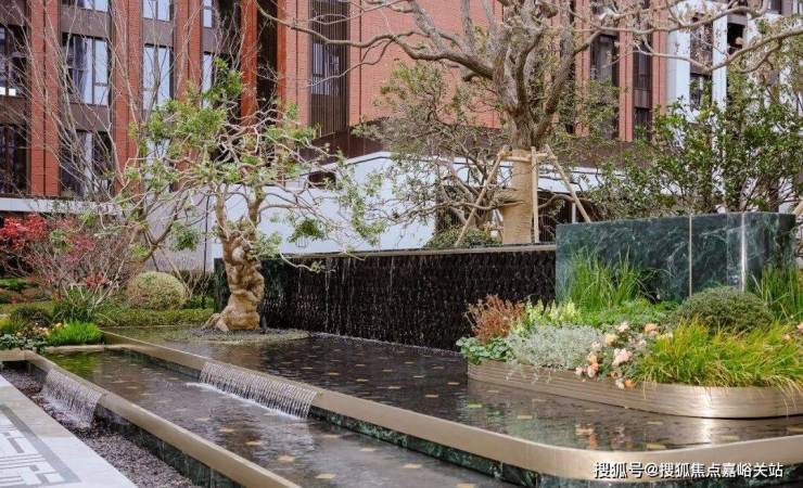 水畔之汀:作为未来主入口迎客水景,延续海派弧形收边设计与叠水效果,幻影蓝流水墙、普拉达绿景墙与奢金影灯撞色融合,中央百年桩景红果冬青与进口红枫搭配,成为点睛之笔。