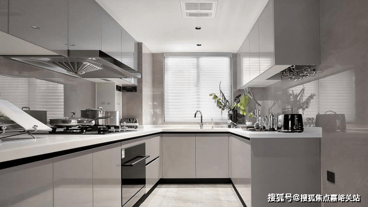 厨房空间,采用 铝合金玻璃PVC饰面的 免漆门套及铝合金移门,三件套使用 老板的油烟机、燃气灶、洗碗机交付,更有 摩恩的水槽和龙头、定制的组合橱柜。