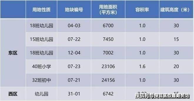 东区和西区最大的不同在于教育和公建设施配套,东区人口更密集,有5幅教育用地,从幼儿园至初中;而西区仅有1幅教育用地,作为幼儿园.