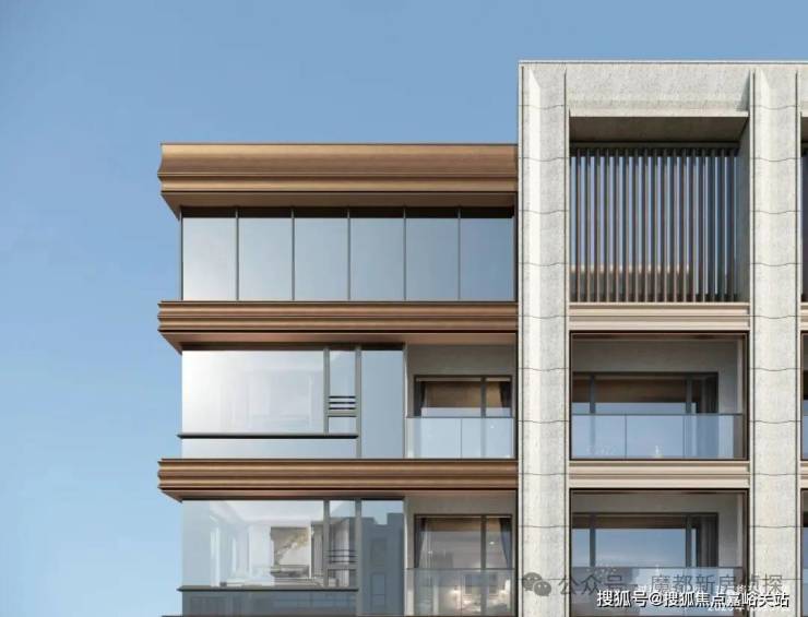 在立面打造上,项目以“石材+铝板”组合成为普陀新的颜值标杆。 可视面采用古铜色金属铝板、米黄色铝板/石材,边套搭配270°大转角飘窗 ,从正面、侧面到背面,立面都保持精致统一的质感。