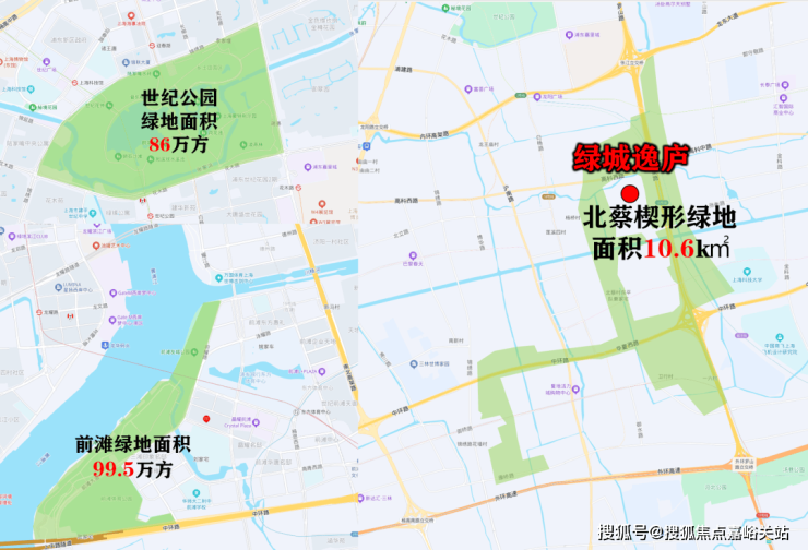同时,绿城·逸庐所处的 北蔡楔形绿地, 规划约10.6k㎡珍稀城市绿地资源,这个体量约是 世纪公园的7.5倍, 前滩的3.7 倍!预计 2027年年底完工!