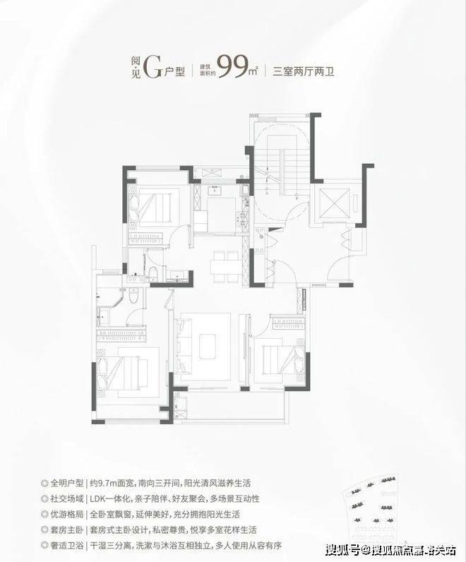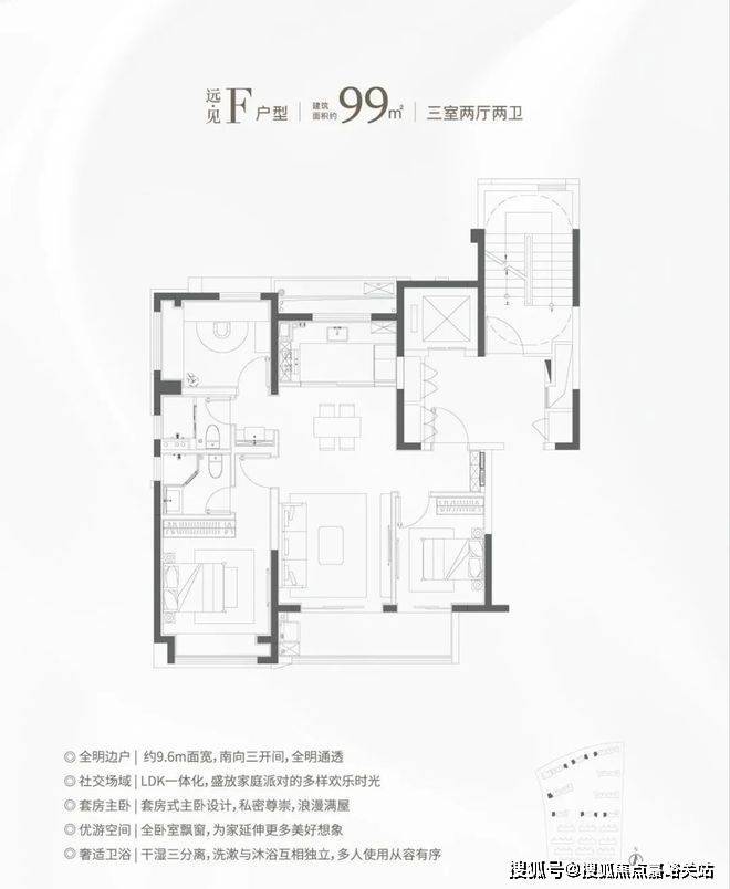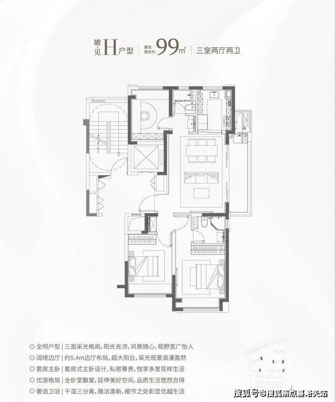 ②建面约99㎡H户型:三面采光,全能景观王炸边厅户型!
