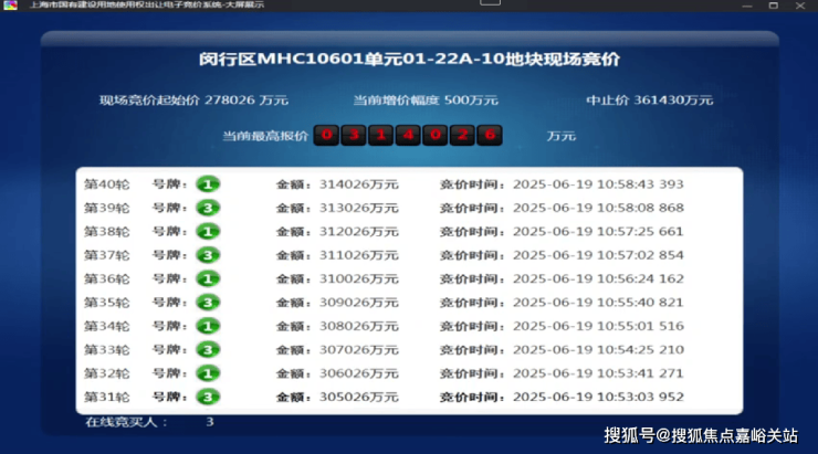 6月19日,闵行1幅地块出让,地块名称为颛桥镇MHC10601单元01-22A-10地块,规划用地性质为住宅用地,出让面积4.05公顷,容积率为2。经过40轮竞拍,最终由上海保利城市发展有限公司竞得,总成交价314026万元,溢价率12.95%。