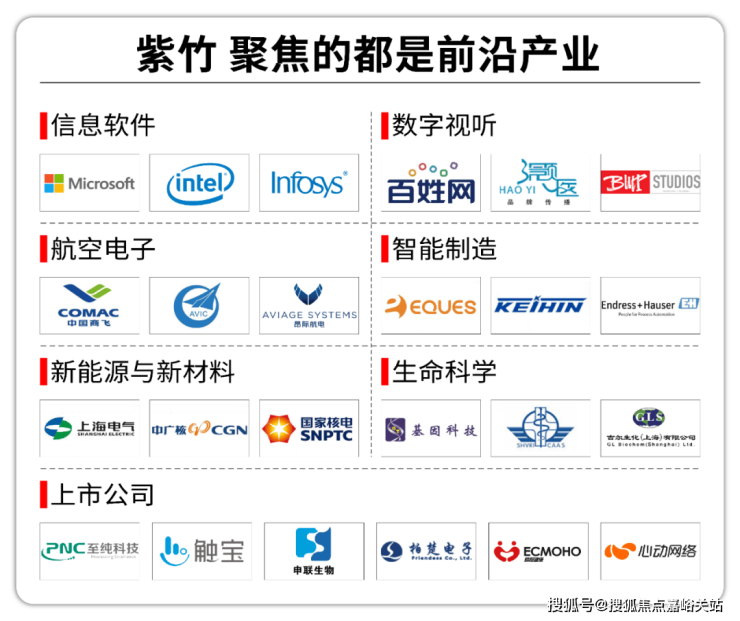 紫竹聚焦“集成电路与软件、新能源、航空航天、智能制造、数字视听、生命科学”六大前沿赛道, 微软、英特尔、可口可乐、晟碟半导体、 印孚瑟斯技术、东软集团、 中国商飞等都多家世界500强进驻。