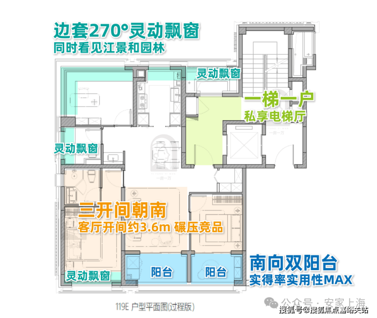 更大的亮点在于双转角飘窗与双阳台的多重暴击。