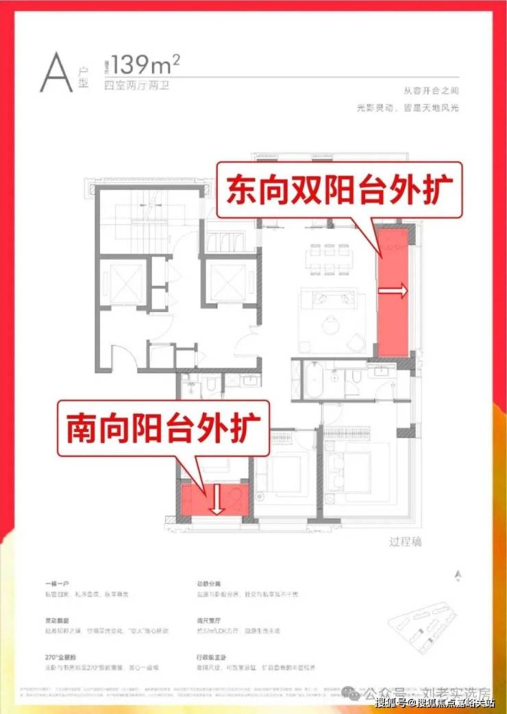 边套标配270°无柱飘窗,部分南北双270°飘窗 。特别建面约139㎡户型,大阳台+满飘窗的组合,直接打开全景舱视野。