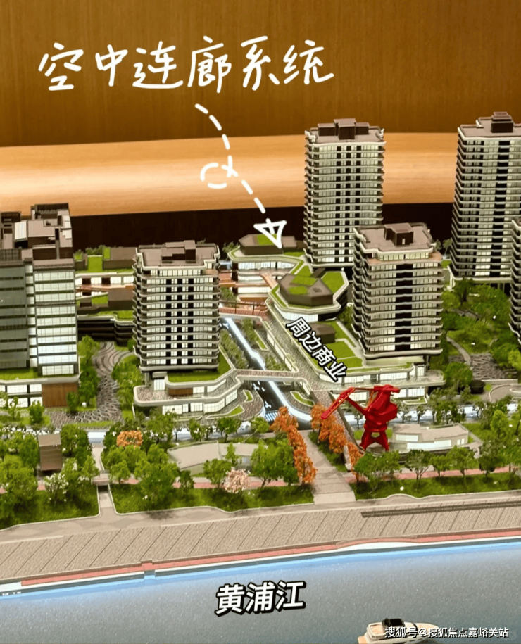 为了最大限度让每户都能享受到江景,项目在楼栋布局上也花了心思。前排381㎡户型所在的楼栋是3层挑高,后排285㎡户型所在的楼栋是6层挑高,这样的设计能有效避免楼栋之间的遮挡,保证大部分房源都有不错的江景视野。另外,项目的空中平台之间有9座廊桥连接,不仅能联动社区内的商业和会所,还能直接通到滨江绿道,以后业主饭后散步,就能直接走到江边,十分便捷。