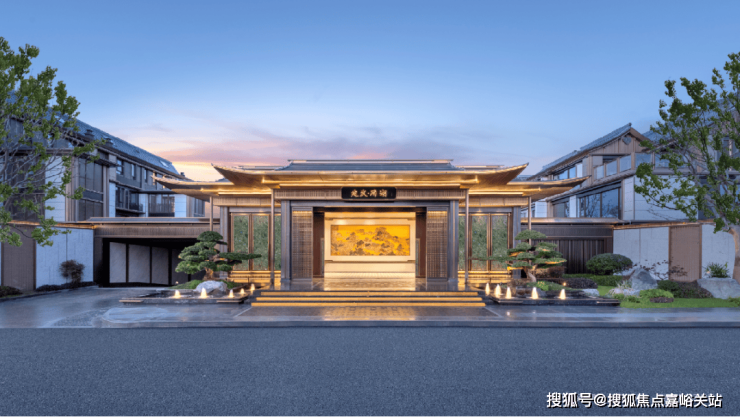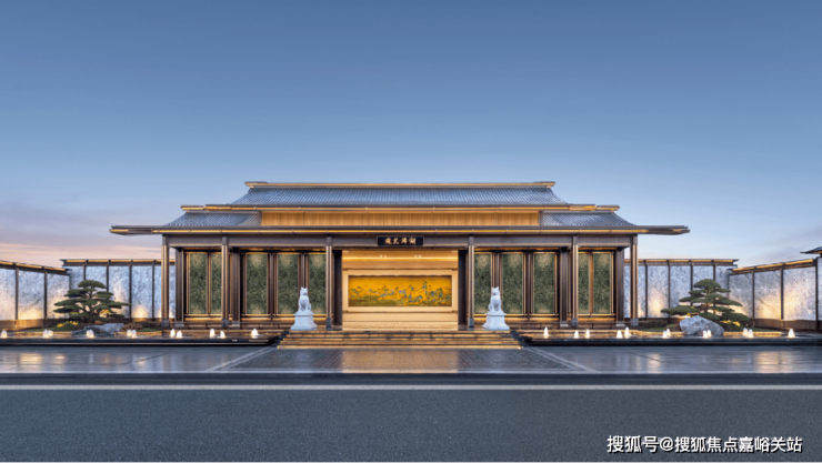 入园之始,恢弘门庭取意宋徽宗《瑞鹤图》,双重飞檐如瑞鹤展翅,气韵生动;约75米宽的仪制门面,以非洲宝石蓝翡翠、西班牙艾伦蓝等奢石铺装,于日光下流光溢彩;齐白石曾孙女齐驸女士亲题 瘦金体 门匾,笔墨间风骨铮然;左右造型罗汉松,如蟠龙拱手相迎;镇宅麒麟静立,祥瑞之气萦绕。