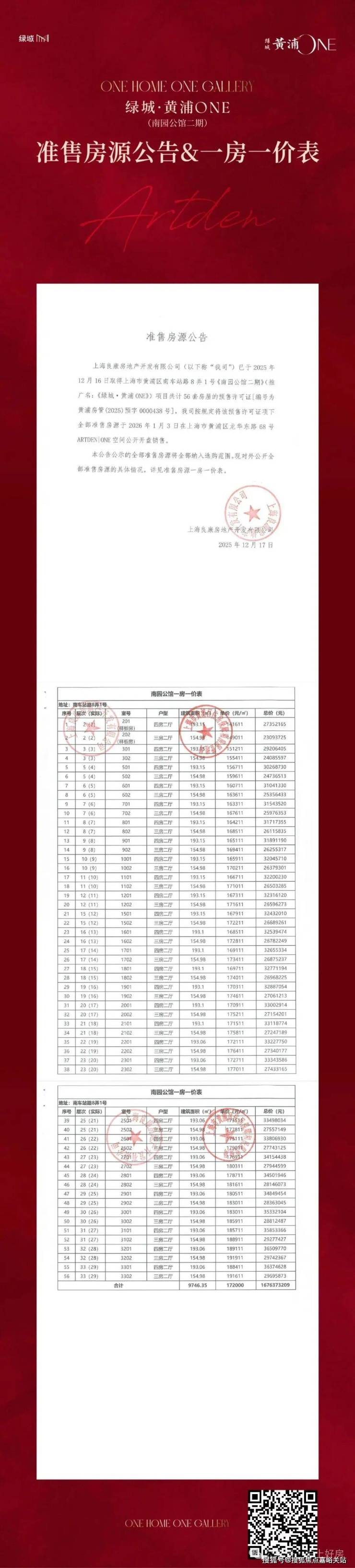绿城黄浦ONE项目一房一价表: